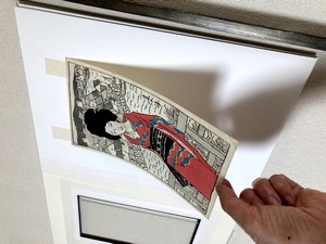 紙等の作品の場合ブックマットに挟むことで見映えがよく、同時に表面のガラスやアクリルに直接触れるのを防ぎます。